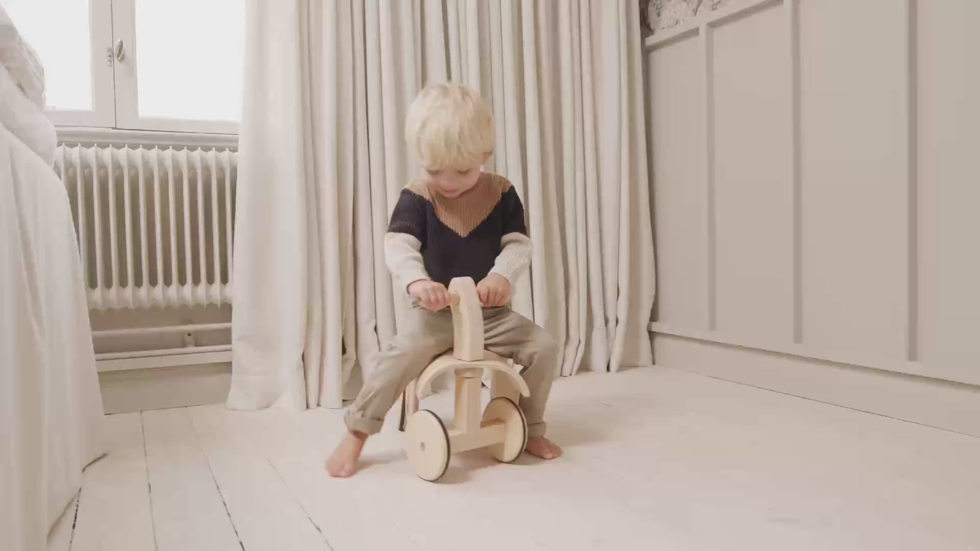 The ride along kart is designed to support active play and early movement. Children can sit and propel themselves forward, helping to develop balance, coordination and body awareness. The sturdy construction and smooth lines make it suitable for everyday indoor play, while the simple design keeps the focus on movement and exploration rather than overstimulation.